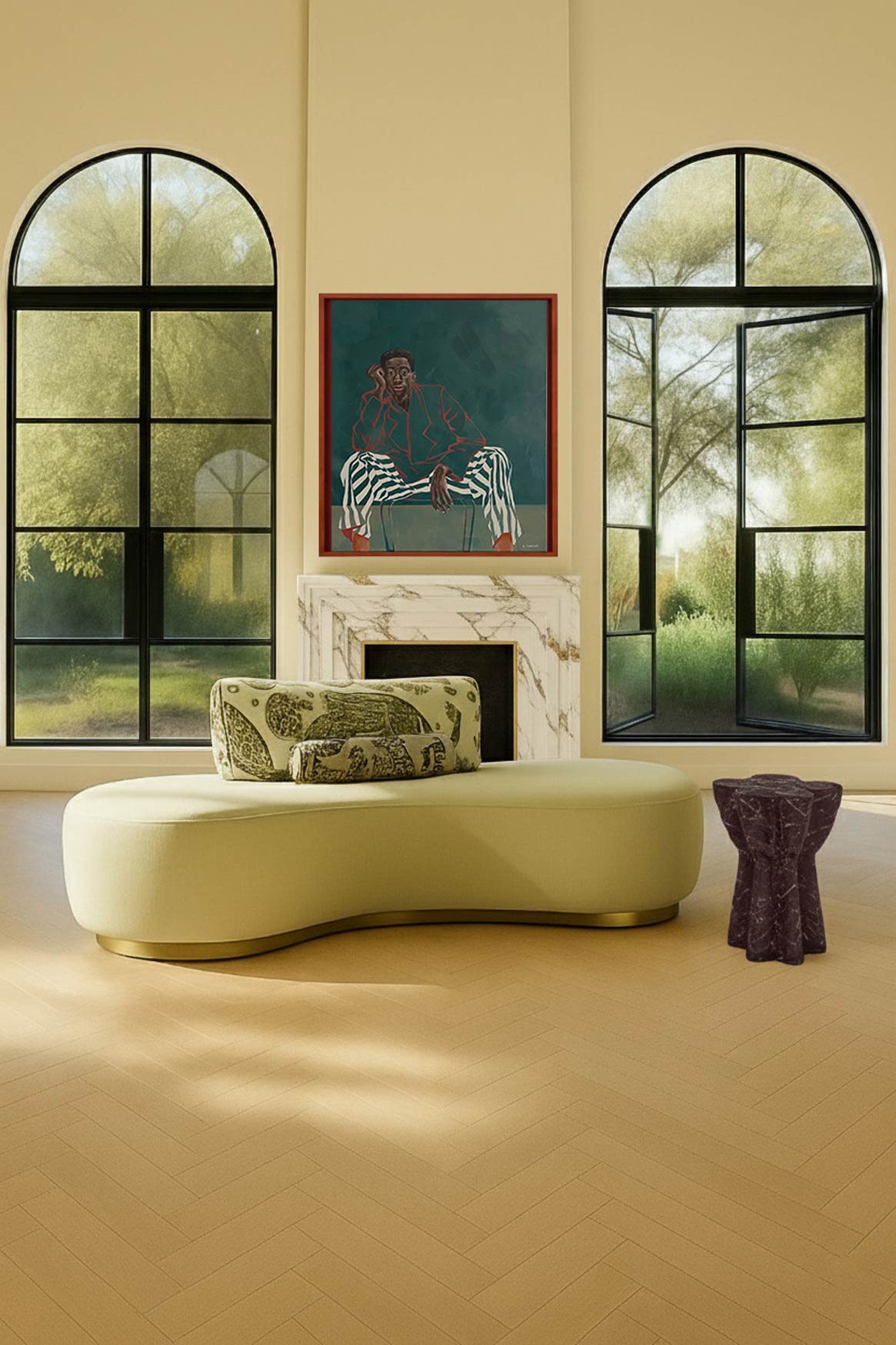 The Curve 8, handcrafted in England, is an elegant bespoke sofa that features an eccentric curved seat, base, and backrest. This exceptionally comfortable sofa is made from the finest high-quality fabrics and is available in two colour options: a contrasting mohair seat/base or a durable faux cream leather seat/base. Both designs are complemented by our renowned velvet tiger backrest and bolster cushion. Stephanie’s eye for detail is evident in the Curve 8 sofa.